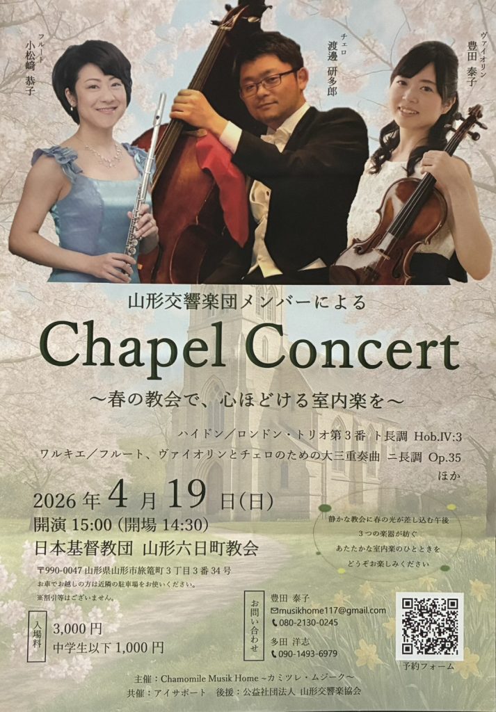 4/19 15時より本協会にて山形交響楽団メンバーによるチャペルコンサートが予定されています。